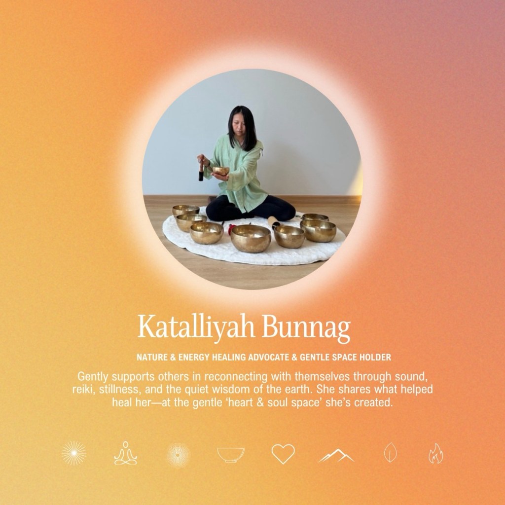 For Kat, her story began from a place of deep love, loss, and courage. After years of learning to manage anxiety and navigating the painful experience of losing her husband, she found healing through sound, energy work, and connection with nature. She discovered that healing is not linear — it’s a cycle of remembering, grounding, and awakening again.